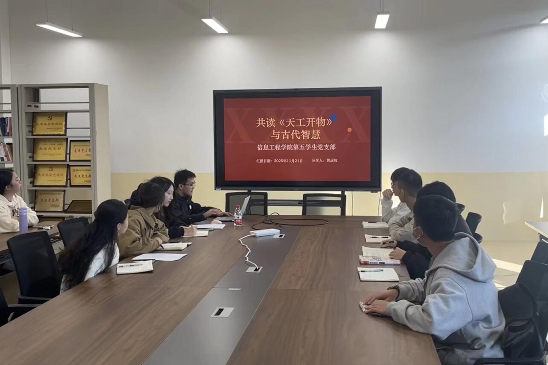 为弘扬中华优秀传统文化,感悟古代科技智慧,提升党员科学素养与实干精神,信息工程学院第五学生党支部于10月27日组织开展了《天工开物》与古代“智慧”主题读书分享会。会议由黄远权同志主讲,支部全体党员参与学习交流。