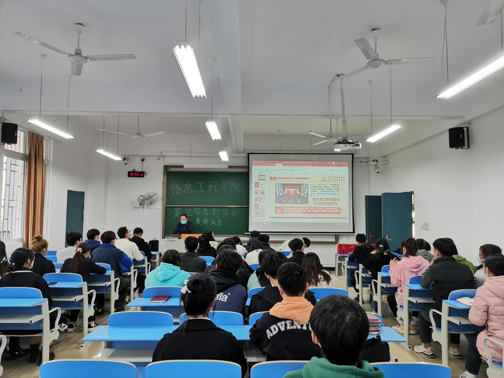 为切实提高党员队伍建设质量,激发我院党支部的生机活力,12月12日,信息工程学院党总支组织我院第一、第二、第三学生党支部在31210教室开展学习贯彻《中国共产党党员教育管理工作条例》专题党课。党课由我院党总支书记郭健主讲,学生党支部全体党员参加。