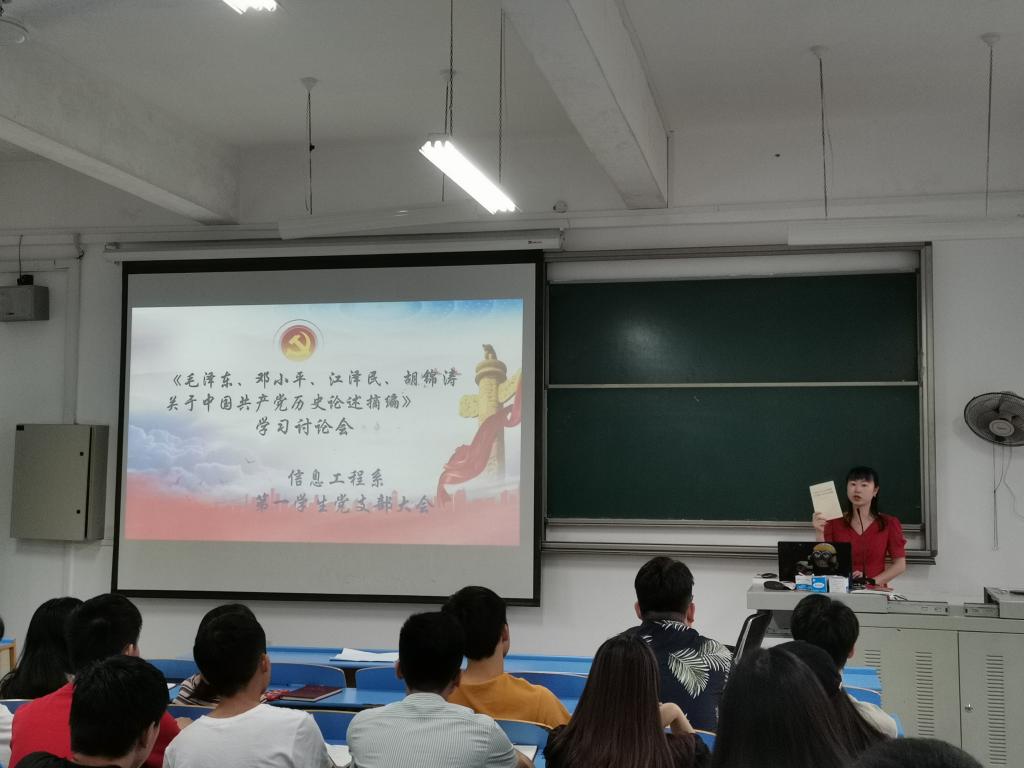 为树立旗帜意识,培养我系学生厚植爱党之心。6月17日,信息工程系学生党支部于32204开展《毛泽东 邓小平 江泽民 胡锦涛关于中国共产党历史论述摘编》学习讨论会,本次会议由信息工程系第一党支部书记廖星男老师主持,第一、第二、第三学生支部全体党员参加。