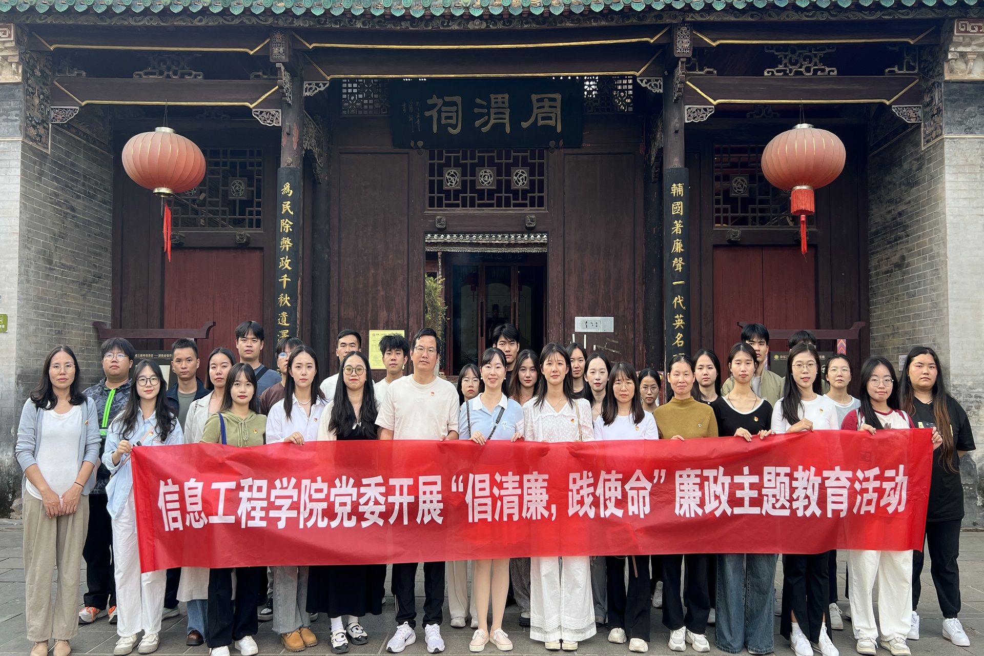 为推动beat365官网清廉学校建设全面提质增效,进一步带动全体干部职工廉洁从政、廉洁从教,培养师生党员崇高的道德品质和坚定的理想信念。信息工程学院党委于11月9日组织学院师生党员前往桂林市恭城县周渭祠,开展“倡清廉,践使命”廉政主题教育。