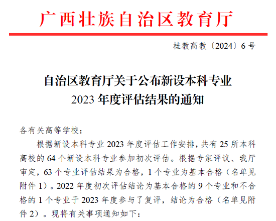 近日,广西区教育厅发布了《自治区教育厅关于公布新设本科专业2023年度评估结果的通知》(桂教高教〔2024〕6号)文件,beat365官网申报的数据科学与大数据技术专业获评“合格”,顺利通过评估。